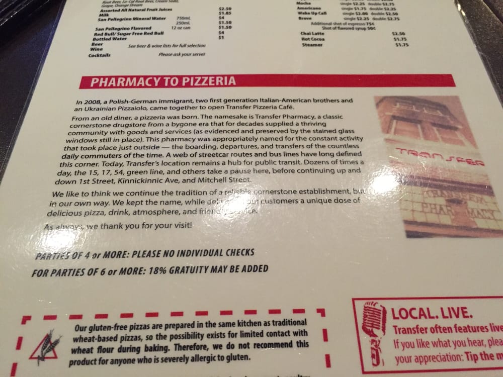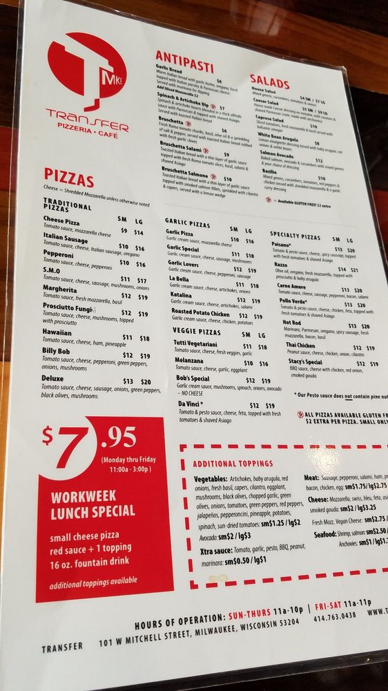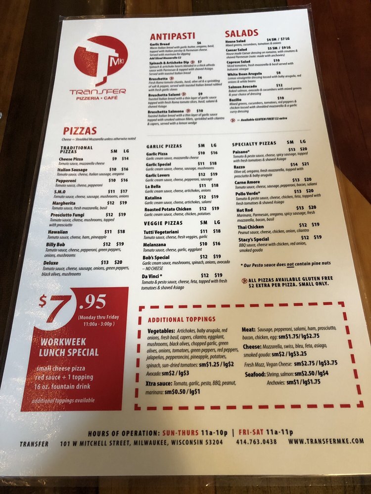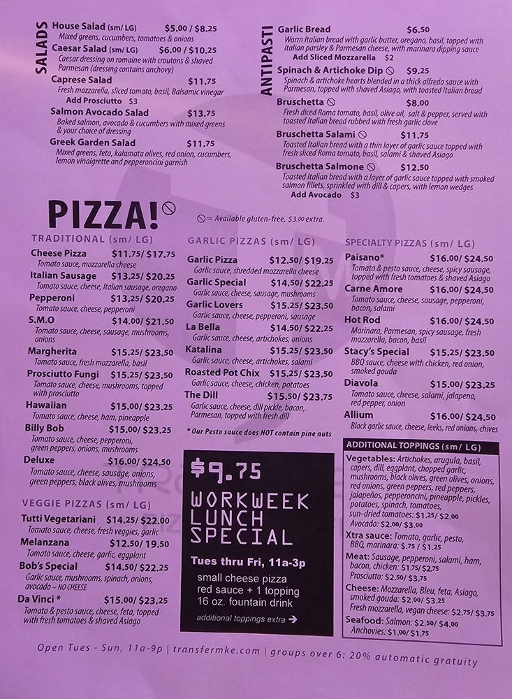 Transfer Pizzeria Café in Milwaukee, WI offers a diverse menu of gluten-free, Italian-inspired pizzas with vegan and vegetarian options. The restaurant caters to a variety of dietary needs and preferences, including wheelchair accessibility and plastic-free packaging. Customers praise the quality of food and attentive service, highlighting the unique garlic sauce pizzas like the Garlic Special and Garlic Lovers. The cozy yet vibrant atmosphere, live jazz music, and friendly staff create a welcoming dining experience. The diverse toppings, sauces, and crispy thin crust make each pizza special, with standout options like the Dill Pickle and BBQ Chicken pizzas. The restaurant's commitment to using fresh, quality ingredients shines through in every dish, making it a must-visit pizza spot in the city.